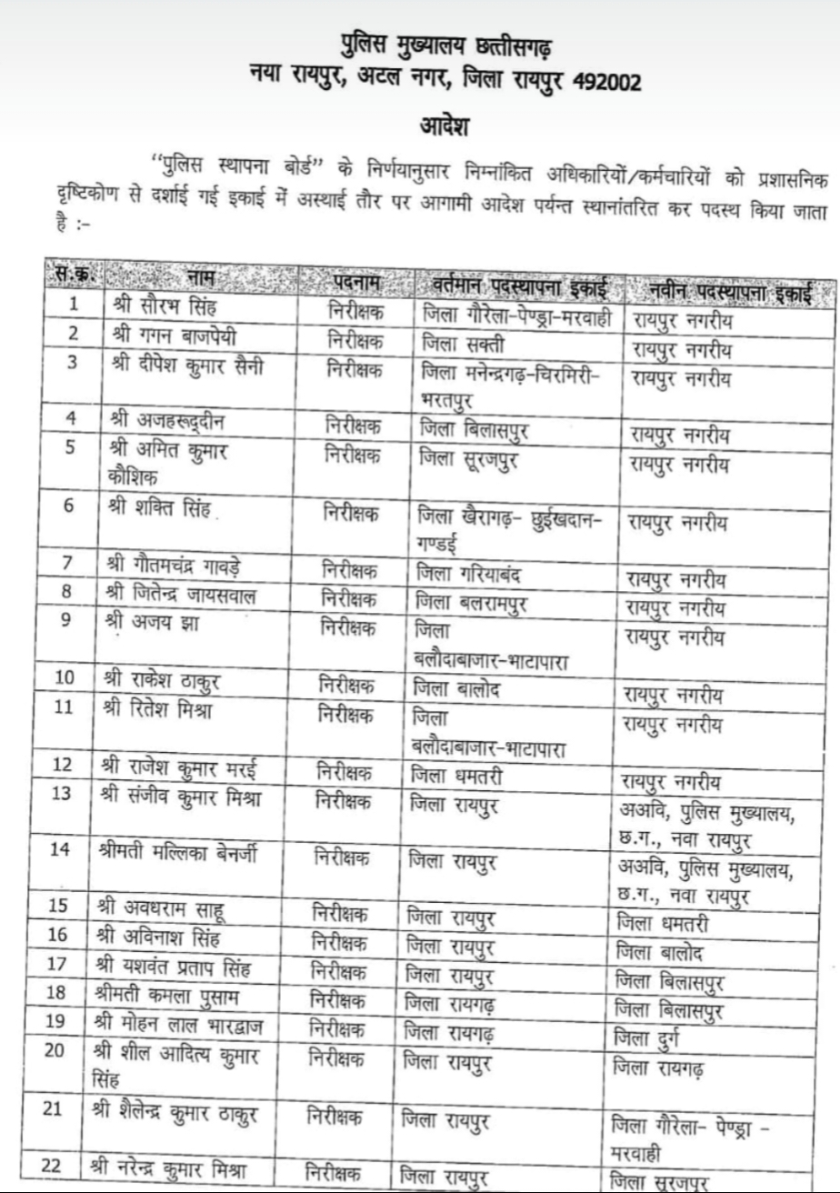 रायपुर सहित जिले पुलिस विभाग बदले गये अधिकारी निरीक्षक दिपेश सैनी रायपुर मनेंद्रगढ़ कमलेश देवांगन